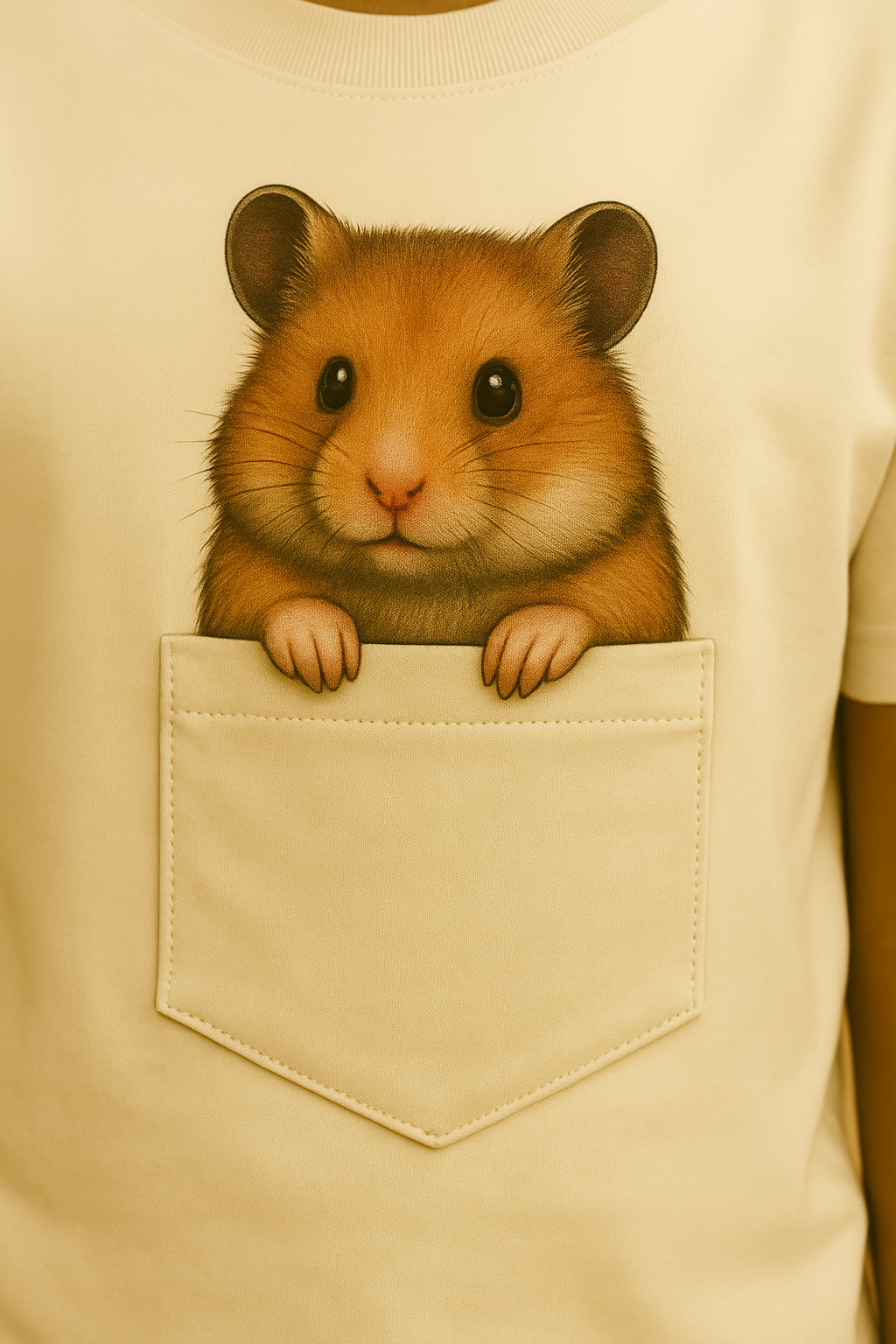 This Hamster pocket pet is small but full of spark. With twitchy whiskers, round cheeks, and curious paws peeking from the pocket, this tiny explorer brings cozy mischief and unexpected charm wherever you go.